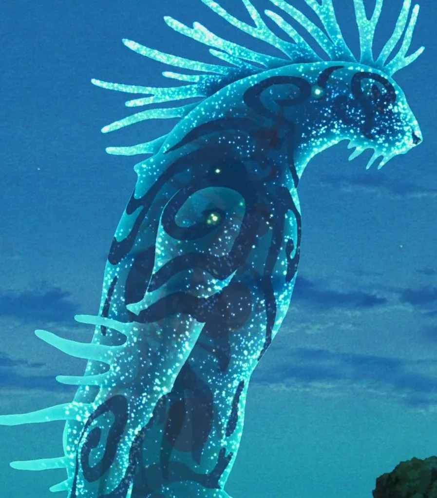 Un personnage unique et mystérieux qui est le dieu de la foret. Un personnage très intéressant à explorer. En apparence, il peut revêtir deux formes. De jour, il a un corps de cerf et une tête plus proche de celle d’un humain. De nuit, il se transforme en géant translucide, et devient le faiseur de montagnes. Il est un dieu de vie et de mort comme le montre la végétation sur son passage. Est-il immortel ? Pourquoi il ne prononce aucun mot ? quel rôle il va jouer dans la quête du prince Ashitaka ?