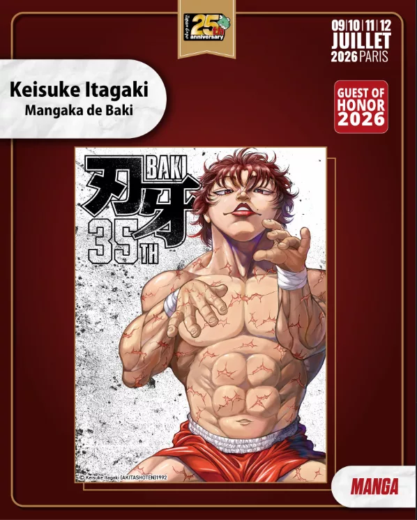 Cette année, deux mangakas de légende seront présents. Keisuke Itagaki, créateur de Baki, d’abord — une saga de combat monumentale, un univers brut et fascinant que ses lecteurs suivent depuis 35 ans avec une fidélité sans faille. Le voir en dédicace à Paris, c’est une occasion qui ne se représentera peut-être pas de sitôt en France.